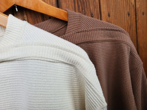 ネップの入った独特な風合いで、リブのボートネックがラフでナチュラルな雰囲気に。