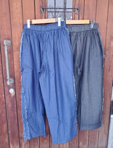 薄い肉感の軽~いデニムを使用したサイドにフリルをあしらったテーパードパンツが入荷しました。